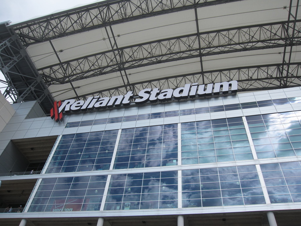 A picture of Reliant Stadium. The building is silver and full of windows. |