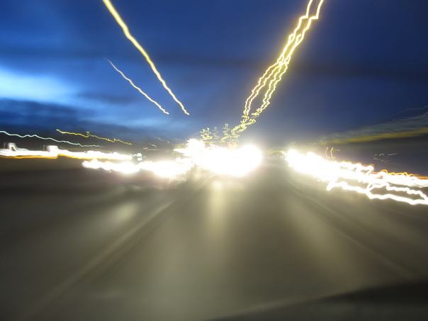 A distorted picture of car headlights. Like those in time lapse videos. |