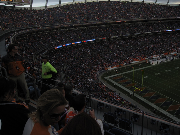 A football game is playing to a packed audience of fans. |