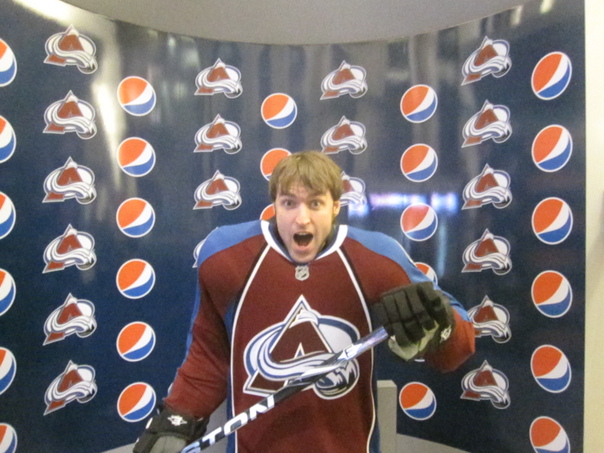 The man is wearing a hockey jersey and is in front of a sponsor background. |