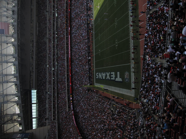 a very big stadium full of spectators and a ground filled with grass. |