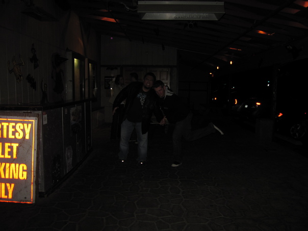 here we can some friends posing for a photo in the dark room |