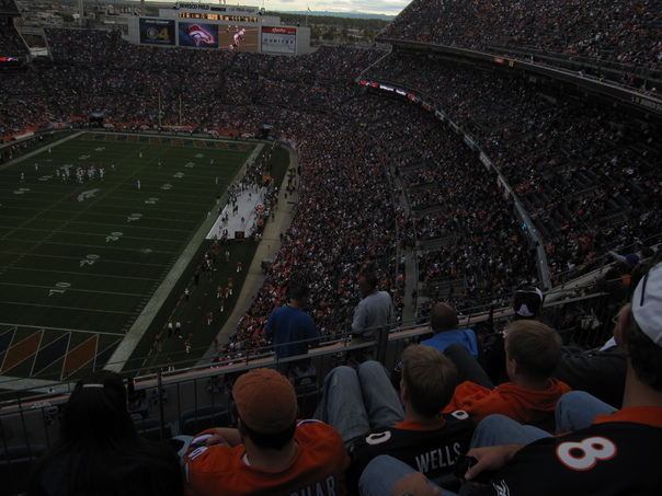 There is a huge stadium with a lot of people watching a game on a green field. |