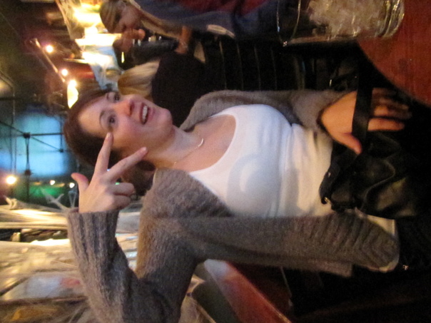 An attractive woman poses for the camera at a restaurant in a nicely fit white shirt and grey cardigan. |