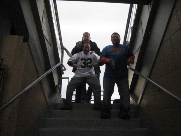 A low angle shot of three friends on top of stairs. |