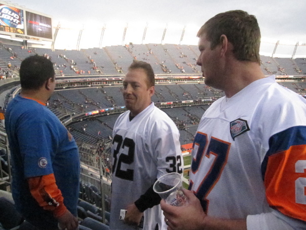 Three men standing on a bleacher in a stadium wearing jerseys. |