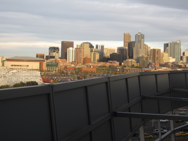 A scenic view of a city skyline featuring a white wooden roller coaster to the left. |
