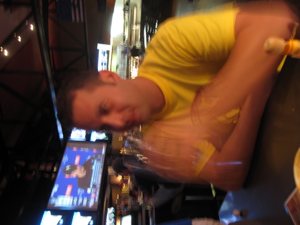 Guy with yellow t-shirt seen waiting for a drink in a pub |
