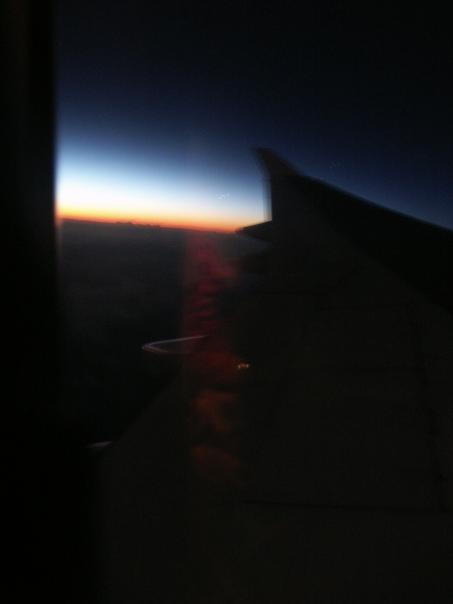 This appears to be a sunset or sunrise as seen through an airplane window.