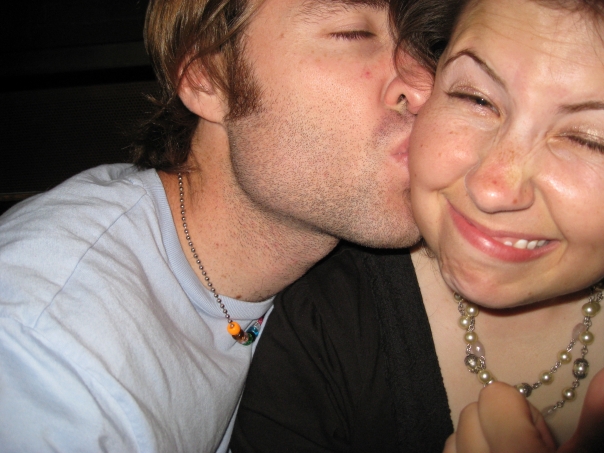 this photo is of a male kissing a female on the cheek. The female is making a really scrunched up face