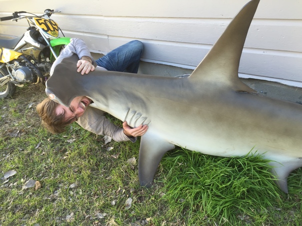 A young man torturing a dying hammer head shark on green grass.