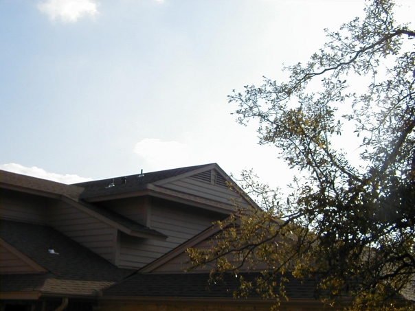 black roofs on the top of the house and a tree hanging on the side