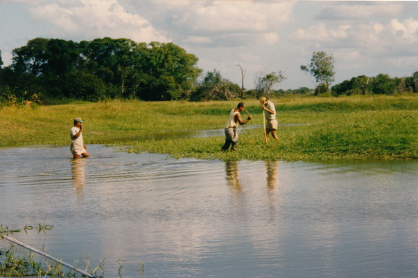 The three man are traveling threw the shallow water and plants. |