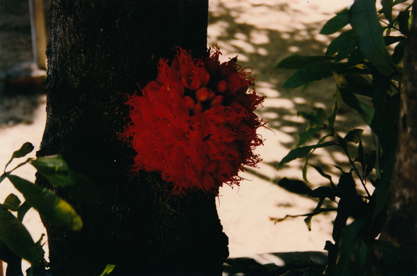 The flower looks as if it is growing from the tree but is it from the plant besides it. |