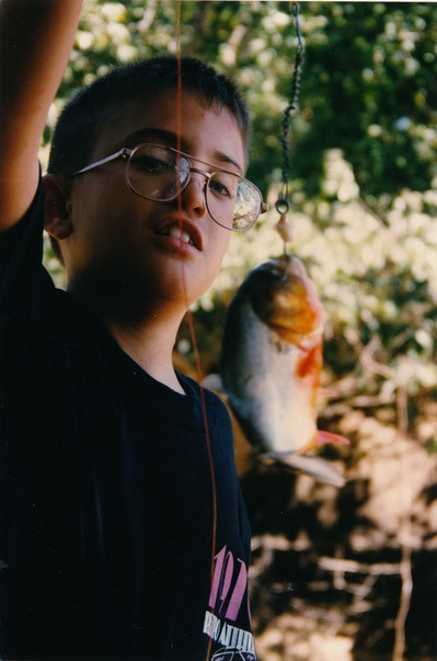 The boy wearing glasses caught a fish that appears to be a koi on a fishing line. |