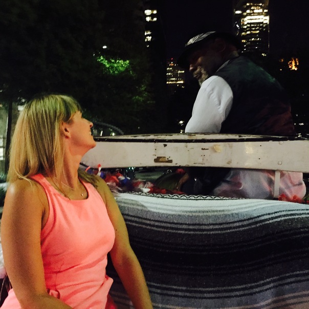 An African American man and white female talking in an urban night setting.