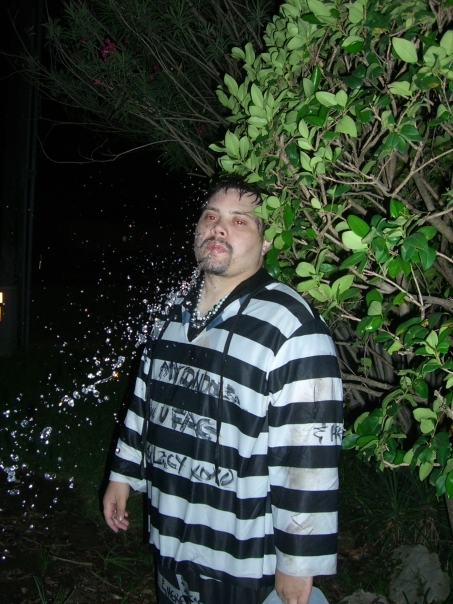 Everyone met over at my Village Oaks apartment sometime around 6pm. I knew someone who was able to rent me a special party bus with a fighter jet canopy welded to the top of it. We immediately started drinking on the bus and went to pick up Dreux at his house where he was bombarded with silly string and then forced to wear a prison suit and drag around an actual ball and chain (a 16 lb bowling ball).
