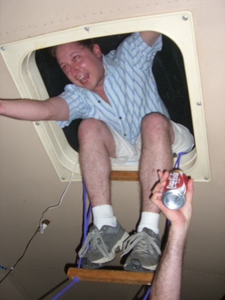 Everyone met over at my Village Oaks apartment sometime around 6pm. I knew someone who was able to rent me a special party bus with a fighter jet canopy welded to the top of it. We immediately started drinking on the bus and went to pick up Dreux at his house where he was bombarded with silly string and then forced to wear a prison suit and drag around an actual ball and chain (a 16 lb bowling ball).