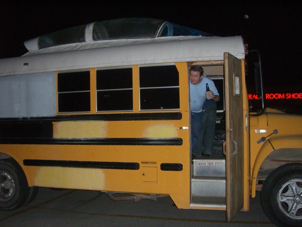 Everyone met over at my Village Oaks apartment sometime around 6pm. I knew someone who was able to rent me a special party bus with a fighter jet canopy welded to the top of it. We immediately started drinking on the bus and went to pick up Dreux at his house where he was bombarded with silly string and then forced to wear a prison suit and drag around an actual ball and chain (a 16 lb bowling ball).
