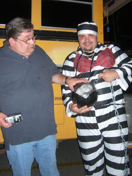 Everyone met over at my Village Oaks apartment sometime around 6pm. I knew someone who was able to rent me a special party bus with a fighter jet canopy welded to the top of it. We immediately started drinking on the bus and went to pick up Dreux at his house where he was bombarded with silly string and then forced to wear a prison suit and drag around an actual ball and chain (a 16 lb bowling ball).