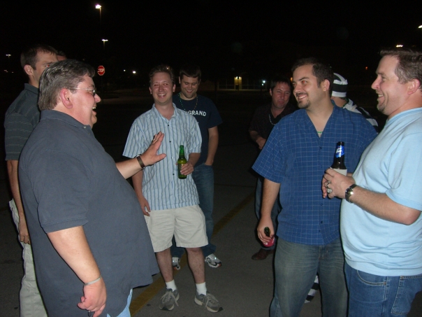 A number of men stand around in shorts or jeans and short-sleeved shirts, talking, laughing, and holding beer bottles. Two are overweight.