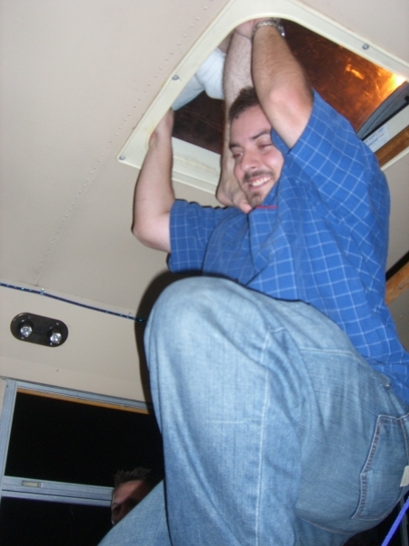 Picture of a man either being lowered or hoisted through a room hatch in a motorhome.