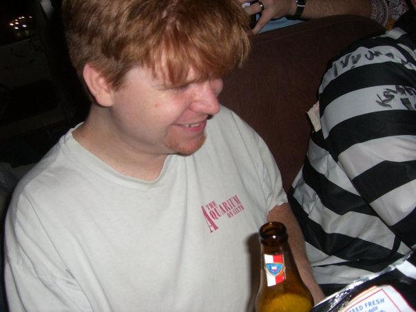 Everyone met over at my Village Oaks apartment sometime around 6pm. I knew someone who was able to rent me a special party bus with a fighter jet canopy welded to the top of it. We immediately started drinking on the bus and went to pick up Dreux at his house where he was bombarded with silly string and then forced to wear a prison suit and drag around an actual ball and chain (a 16 lb bowling ball).