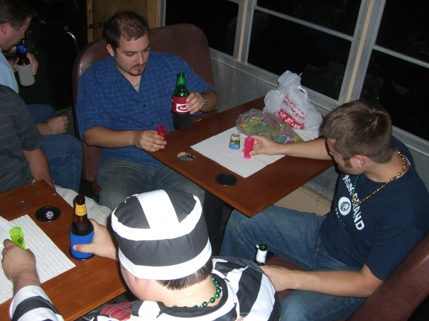 Everyone met over at my Village Oaks apartment sometime around 6pm. I knew someone who was able to rent me a special party bus with a fighter jet canopy welded to the top of it. We immediately started drinking on the bus and went to pick up Dreux at his house where he was bombarded with silly string and then forced to wear a prison suit and drag around an actual ball and chain (a 16 lb bowling ball).