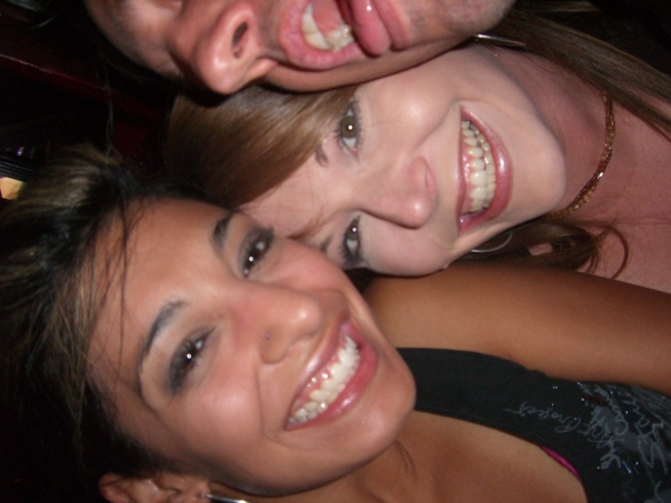 a sideways picture of a beautiful girl smiling next to another girl and guy.