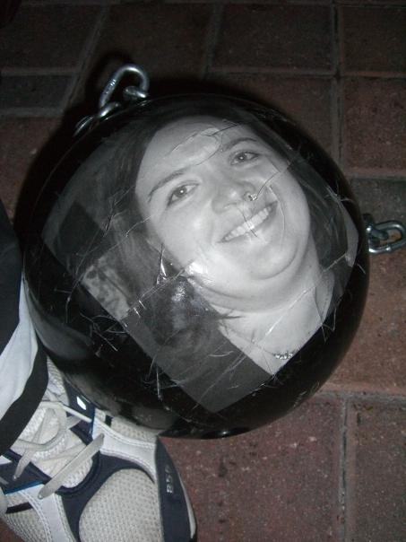 A woman's face picture taped to what looks like a "ball and chain" costume. The entire picture is black and white except for the brick background.