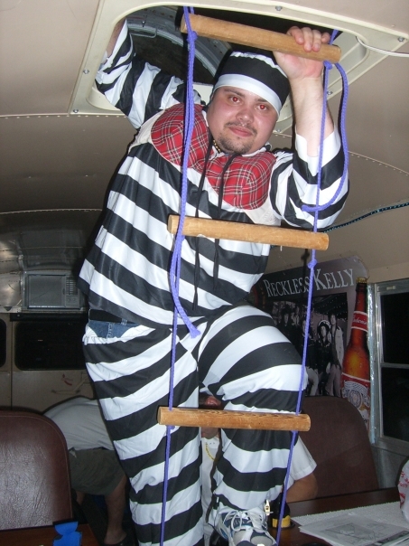 Everyone met over at my Village Oaks apartment sometime around 6pm. I knew someone who was able to rent me a special party bus with a fighter jet canopy welded to the top of it. We immediately started drinking on the bus and went to pick up Dreux at his house where he was bombarded with silly string and then forced to wear a prison suit and drag around an actual ball and chain (a 16 lb bowling ball).