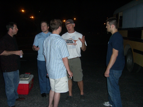 Everyone met over at my Village Oaks apartment sometime around 6pm. I knew someone who was able to rent me a special party bus with a fighter jet canopy welded to the top of it. We immediately started drinking on the bus and went to pick up Dreux at his house where he was bombarded with silly string and then forced to wear a prison suit and drag around an actual ball and chain (a 16 lb bowling ball).