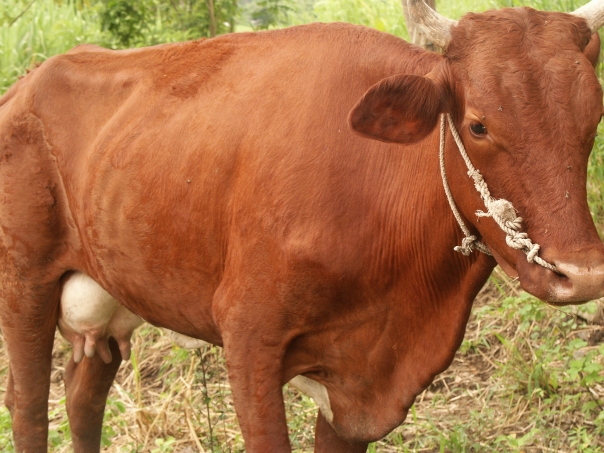 A brown cow is in a field with a rope tied through its nose and around the back of its head.