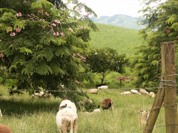Livestock graze in a green field under a mimosa tree with fragrant pink blossoms.