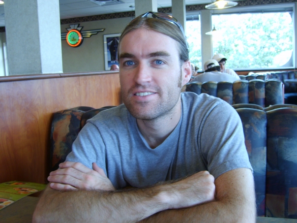 A strikingly handsome young man with bright blue eyes wearing a gray short-sleeved shirt and sunglasses on top of his head.