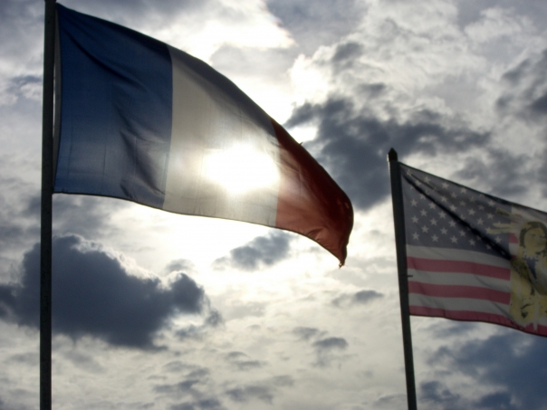 Two flags flap in the breeze as the wind gently blows them in opposite directions.