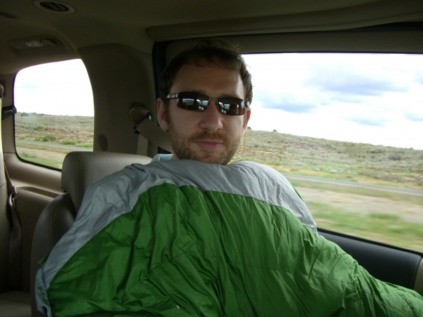 A man wearing sunglasses is sitting in a vehicle seat, covered with a sleeping bag.