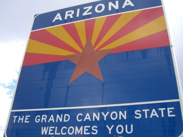 The Arizona state sign. The sign reads: "Arizona. The Grand Canyon State Welcomes You"