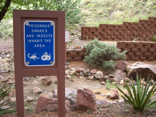 A sign in a desert landscape warns of poisonous insects and poisonous snakes.