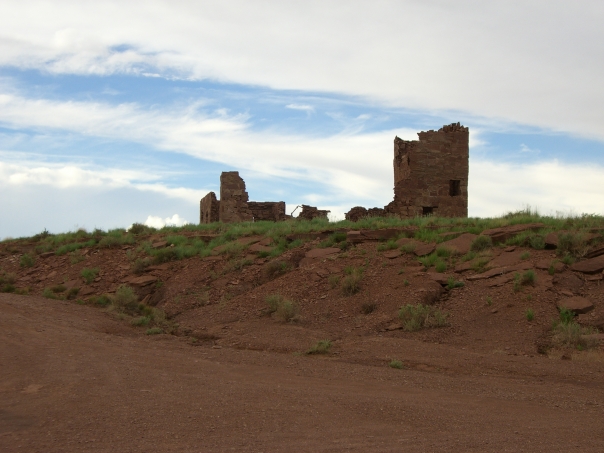 Red dirt road. Stone building, falling apart. Blue sky and white clouds in the background. Possibly Mexican.