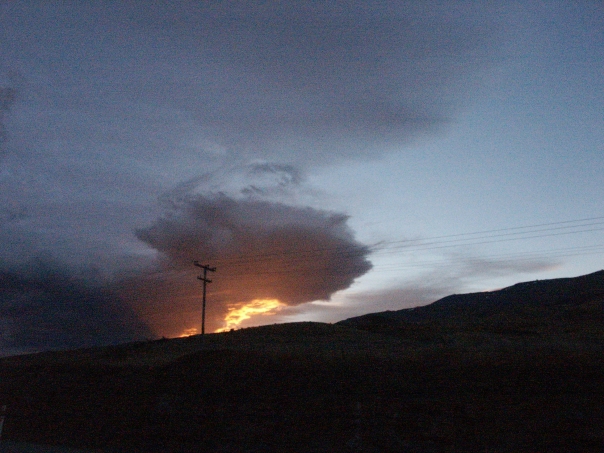 The last light of sunset illuminates the edge of a cloud as the sun dips behind a hill.