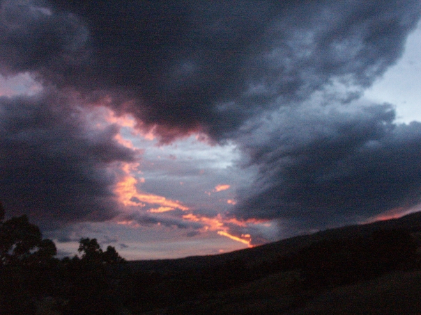 streaks of an orange and pink sunset glimpsed through dark storm clouds over a field