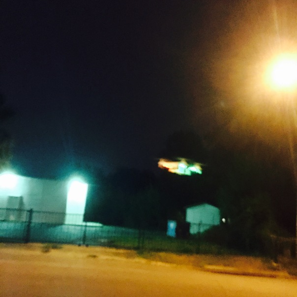 A brightly lit helicopter flies by in the dark of the night in a blurry image.