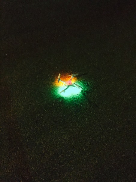A drone is illuminated by green and orange lights in this night photo.