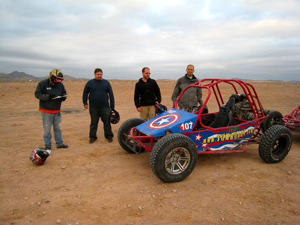 We made it a few miles into the desert when the front shock on Dreux's buggy snapped in half and flew into the air. We all had to drive back and get it repaired.