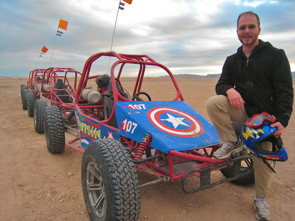 We made it a few miles into the desert when the front shock on Dreux's buggy snapped in half and flew into the air. We all had to drive back and get it repaired.