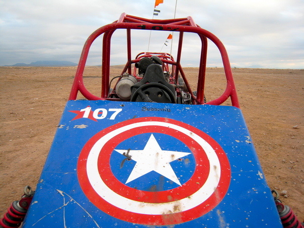 We made it a few miles into the desert when the front shock on Dreux's buggy snapped in half and flew into the air. We all had to drive back and get it repaired.