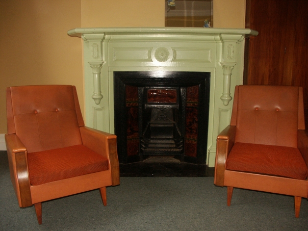A cherrywood and white fireplace is between two vintage style chairs.