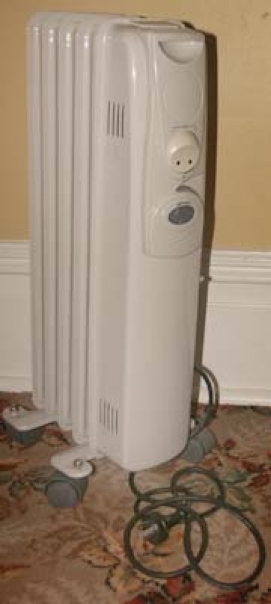 Unplugged portable radiator sitting on a floral rug next to a white and tan wall.