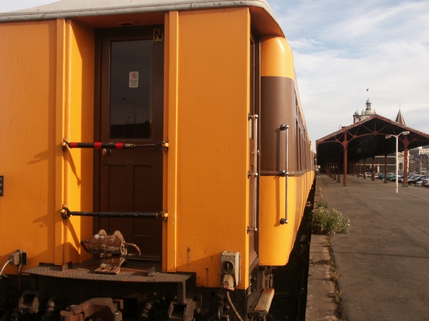 a backwards view of a train colored a yellowish orange as it leaves the station.